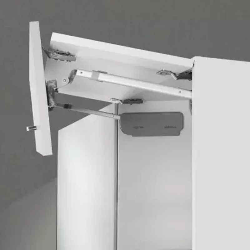 Sistema para abertura de portas bi-partidas de gabinetes aéros, com articulação central e deslocamento vertical superior.